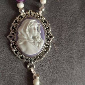 Handmade by me. features faux purple pearl 8mm beads with white seed beads . Mary with infant Jesus cameo rosary center, silver crucifix. strung on c lion cord.