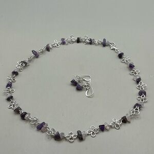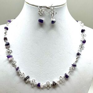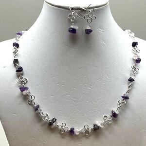 This exquisite sterling silver necklace showcases a harmonious blend of silver elements and deep purple amethyst and also rose quartz beads, creating a striking contrast. The alternating pattern of pink and purple beads adds a rhythmic elegance to the design. Perfect for special occasions, this piece offers a versatile wearability with its refined and sophisticated look. Matching sterling silver earrings included.