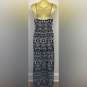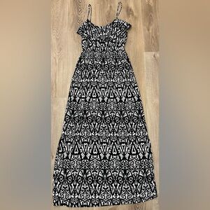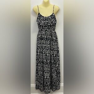 This Soprano dress features a striking black and white pattern in an elegant a-line silhouette, perfect for casual and resort wear.