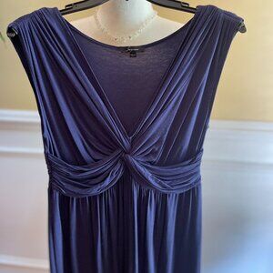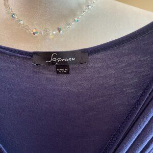 Here is a lovely, soft, and casual navy blue dress made by Soprano, sleeveless, low V-neck front, no back zipper, gathered shoulders, midriff knot and small gathers, makes a nice silhouette. Size and fabric tag not available. Fabric is synthetic and 3% spandex giving this very comfortable dress plenty of stretch. Condition of this very lovely dress is very good, no flaws. Like wearing a Tshirt dress, only not a Tshirt. You can machine wash this dress carefully in cold water then hang to dry. Shoulder to hem is 36 inches. This is a very comfortable dress to wear for any occasion.