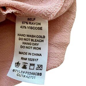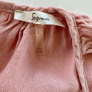 This Soprano Dusty Pink Cold Shoulder Romper, women's size large, features a single button and tie, pockets, and an elastic waist. Made from a comfortable blend of 57% rayon and 43% viscose. Attached shorts.