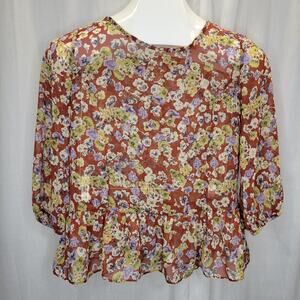 Soprano Floral Sheer Top with 3/4 Sleeves and Peplum, S