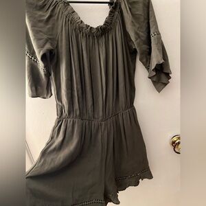 This green jumpsuit features a relaxed fit with a ruffled hem and an elastic waistband for added comfort. The flowy shorts-style bottom is adorned with delicate lace trim, offering a feminine touch to the overall design. Perfect for a casual day out, this jumpsuit combines style and ease effortlessly.