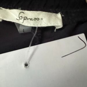 For sale are these Soprano women's navy joggers size large, slash side pockets, white tuxedo stripe down outside legs, barrel cuff tapered legs. Elastic pull on waist band with drawstring closure and faux zipper flat front. Polyester fabric feels so light and silky. Size Large. Machine wash, hang dry. Style #P2773