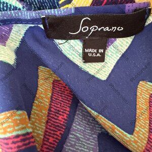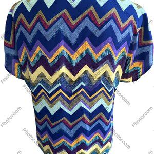This Soprano blouse in size Small is a bold and playful piece that instantly brightens up any outfit. Made of lightweight polyester, it features a lively multicolor zig zag pattern that adds energy and fun to your wardrobe. The double V-neckline—both in front and back—adds a stylish and flattering touch.