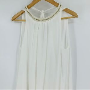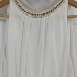 Soprano Swing Dress 9269 Small Chiffon White Beaded Sleeveless New High Neck Lined. New unworn, no paper tags. Measures: pit to pit 20", length 36". Ship daily, professional seller highly rated.