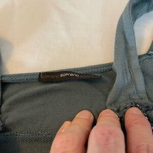 Soprano cotton dress. Stretchy knit cotton blend. Grey color. Embellished neckline. A-line with ruched bust. Wide straps.