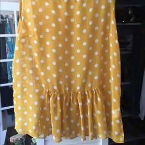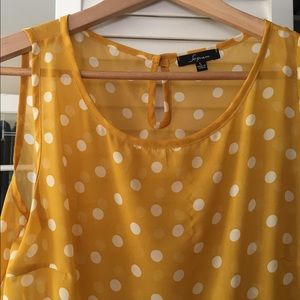 Sleeveless yellow blouse with white polka dots. Slight peplum in front.