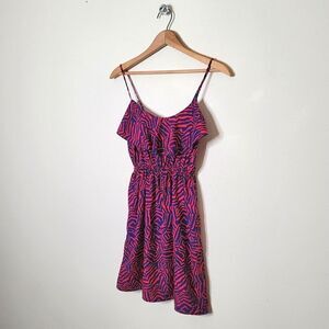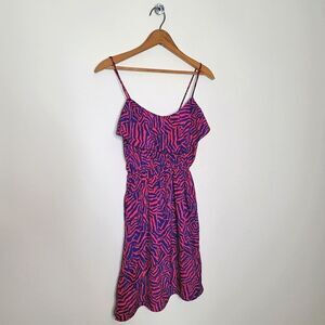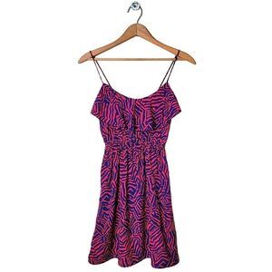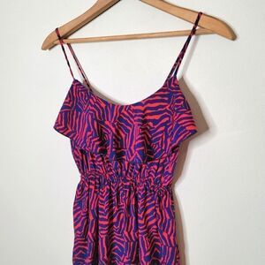 This is a lovely Sorano sleeveless dress that features a ruffled top and blue/red patterning:)