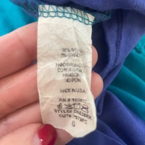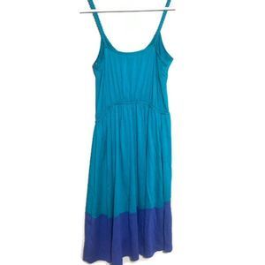 Really cute Soprano high low color block dress size small. Dress is turquoise in color and bottom has darker purple/blue color blocking. Elastic waist and rope like straps and neck detail at the top. Very gently used and worn only a few times. Feels soft and stretchy. Made of 95% rayon and 5% spandex.