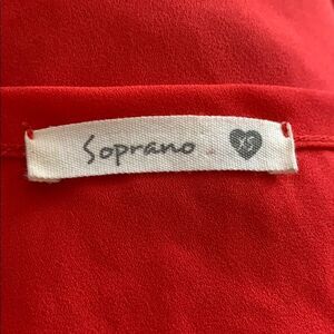 Sprano bright red-orange scoop neck top. Neckline band. Short drop sleeves. Flowing crepe-like fabric. No fabric content tag. Size XS. Excellent condition. Nonsmoking home.