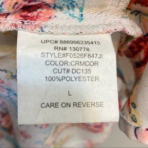 New with tags short sleeve V-neck floral mini dress. Buttons the entirety of the front and ties in the back. Cream with red, pink and green floral print.