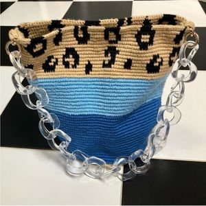 Blue leopard midi bucket bag with leopard design and acrylic strap.