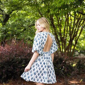 Light, free, and quietly confident — Soreia is crafted in breathable cotton with hand-blocked florals. The structured waist offers definition, while voluminous balloon sleeves bring a bold, feminine touch. An open back with a delicate button closure adds unexpected grace—effortless by day, striking by night.