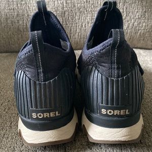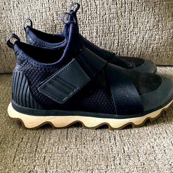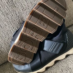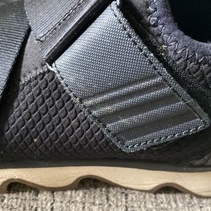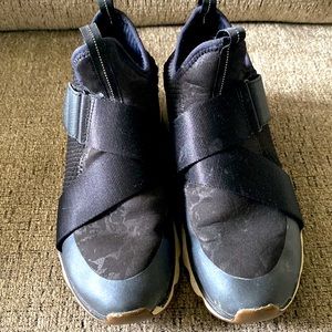 "Kinetic sneaker shoe- mesh upper w/ overlapping elastic straps w/ Velcro closure. Light, comfortable.