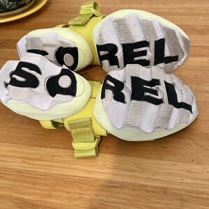 Sorel Highlighter neon green/yellow light weight sandals with adjustable straps and side release buckles. Used in great condition with normal signs of wear.