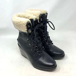 Sorel After Hours Lace Shearling Boot Black Leather Wedge Size US 6