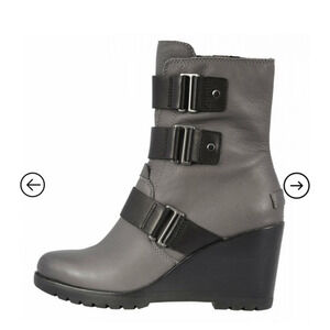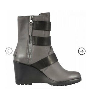 Brand: Sorel Size: 6 Color: Gray/ black Details: Upper: Leather upper with leather & microfiber lining Footbed: Die-cut memory EVA footbed with pigskin top cover Midsole: Molded BPU wedge midsole with EVA insert in forefoot Outsole: Molded rubber outsole with a leather-wrapped heel Heel height: 3.29 in. Platform Height: 0.44 in. Keywords: Sorel After Hours Boots, Sorel Wedge Boots, Sorel Leather Boots, Sorel Strappy Boots, Sorel Almond Toe Boots, Sorel moto boots, Sorel platform wedge boots