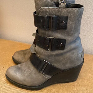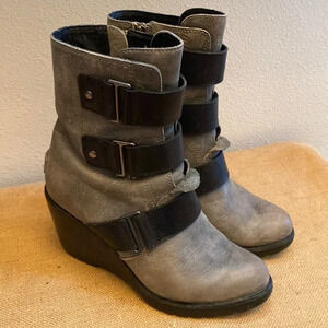 Sorel After Hours Wedge Moto Boots Gray/ black Leather Strappy Almond Toe Size 6