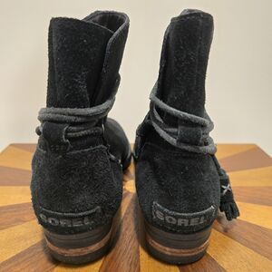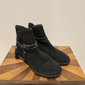 Sorel Farah Tassle Booties. Black suede leather boots. Tie tassle accents. Pull on.