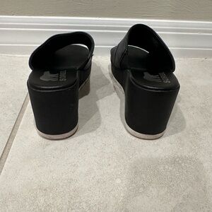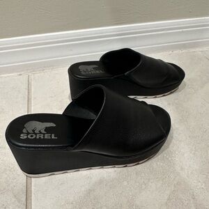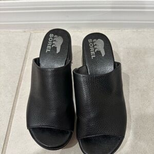 Sorel open-toe slides in black leather. Sleek and modern design. These would be great with a distressed pair of jeans and a blouse for a day out with friends! Overall these are in great condition with discoloration/wear to the bottom