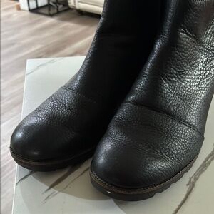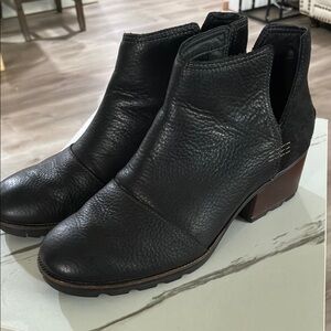 These Sorel ankle boots feature a sleek black design with cut-out sides for easy wear. The medium-height block heel and sturdy sole provide both style and comfort, making them perfect for everyday use. Supple full grain leather upper and suede back, wood block heel. Note wear on the heel.