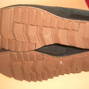 A pair of Sorel waterproof "Evie" pull-on black suede and leather boots with ridged rubber soles, small elastic panels o front-sides for comfort and cushioned leather insoles. Made for style with comfort. Marked 9.5.Heel.5" WIdth 3.5" Height 6" Length measured against wall w tape measure underneath" 11" In good condition - only mild wear. Retail is $130.