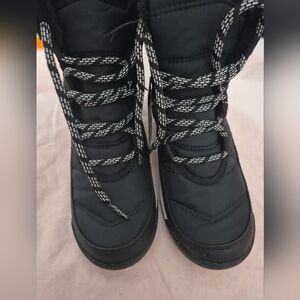 Sorel black winter boots with white accents. Durable and stylish for cold weather.