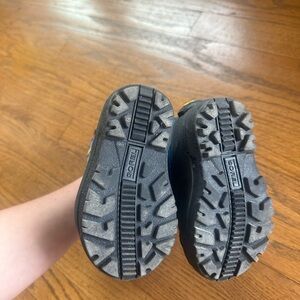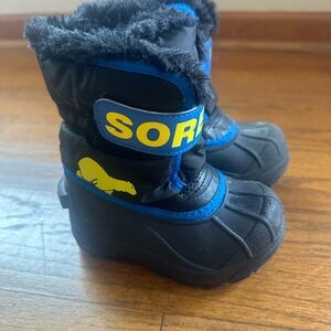 Sorel kids' boots in black and blue. Yellow lettering on straps. Cozy and durable.