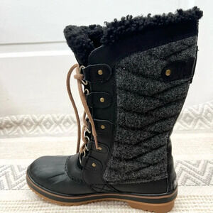 Stylish winter boots by Sorel. Black leather with gray fabric. Durable and warm. Perfect for cold weather.