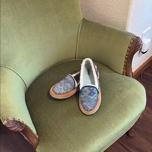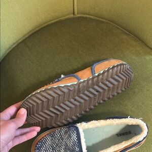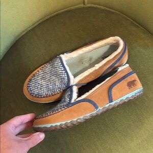 Stylish Sorel moccasins. Blue woven upper. Tan leather trim. Comfortable and chic.