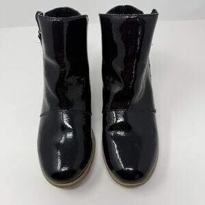 Sorel Women's Winter Ankle Boots. Black and tan in color. Tagged Size 5. These women's Sorel boots feature a coated leather exterior upper, a hidden wedge, side zip and a rubber outsole. Style number 1916441010. In preowned condition with minimal signs of wear.