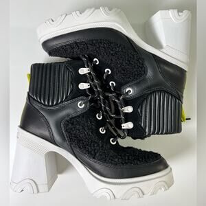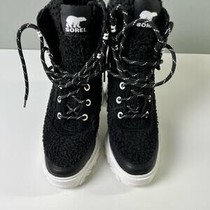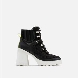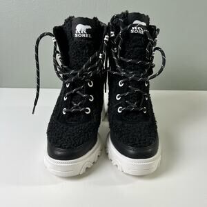 Sorel Brex Heel Black Leather White Cozy Sherpa Lace Up Bootie 7.5