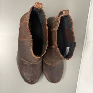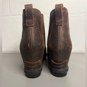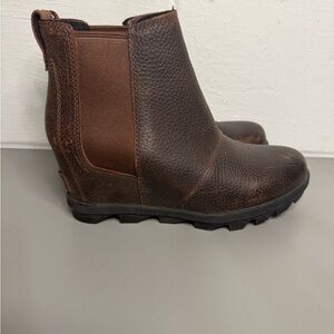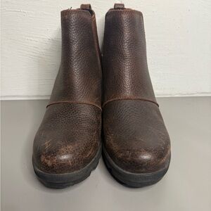 These Sorel Chelsea boots feature a rich brown leather with a rugged, weathered finish, perfect for everyday wear. The boots are designed with a sturdy black rubber sole and a practical rounded toe, ensuring both comfort and durability. The two-tone brown color scheme adds a touch of style to this classic boot silhouette.