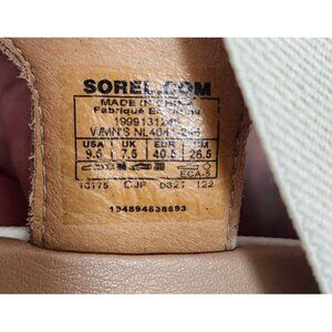 This is a Sorel Cameron Flatform Slingback Sandal in Honest Beige Chalk White, size 9.5 for women. The sandal features a slingback style and is designed by the brand Sorel.