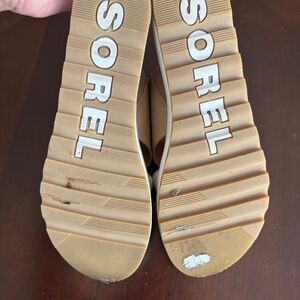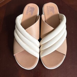 Sorel Description: SOREL classic mule sandal's design features a puffy strap and plush cushioning that offer walk-all-day comfort and feels like clouds Versatile Design: SOREL's eye-catching sandals are perfect for a variety of scenarios such as beach leisure, travel, walking, shopping, and weddings Soft and Comfy: Made with full grain leather straps and traditional leather crafting techniques to give you extra durable yet comfy classic sandals Crisscross Straps: Open-toe mule sandals with wide crisscross straps and puff detailing feature molded BPU-PU wedge wrap in the synthetic lining Footbed: EVA foam footbed with synthetic top cover offers lift and walk-all-day comfort while SOREL eye-catching scalloped sole gives you a new look