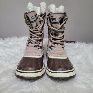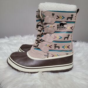 Sorel Caribou waterproof insulated snow boots in brown and pink with Aztec deer print, womens size 5.