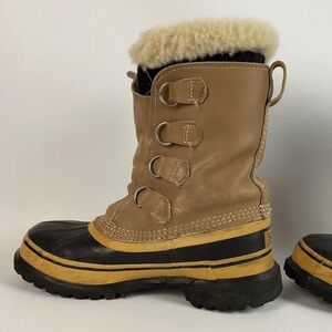 Sorel Caribou Boots Womens 6 Black Tan Rubber Leather Upper Lined Plush Warm