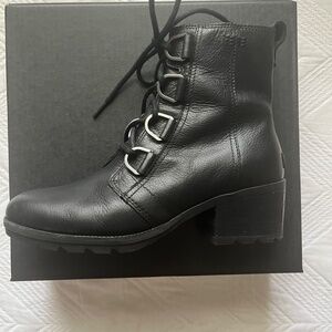 These Sorel Cate lace up boots are in excellent condition. The have a nice heal - not too high - and soft yet durable leather. The sole is perfect for winter weather. Size 8.5. Ships in original box.