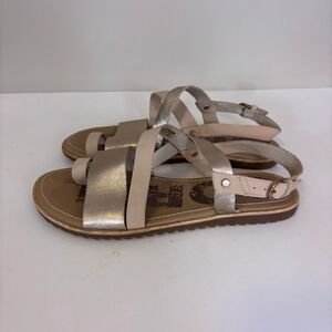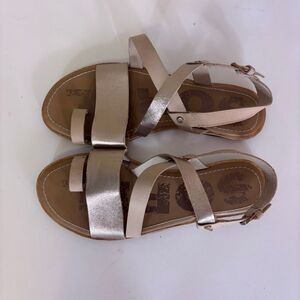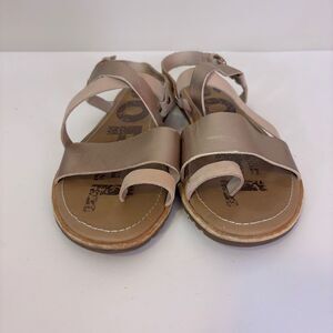 Great pre-owned condition Sorel Cream with Silver Shimmer Leather Strappy Flat Sandals Women's 7