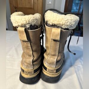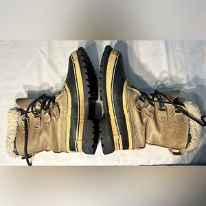 Heavy duty pair of winter boots by Sorel. Used but still have life left in them. Lined with a wool blend for warmth. Please look at photos carefully as these are well worn in certain areas, but no rips and the soles are solid.
