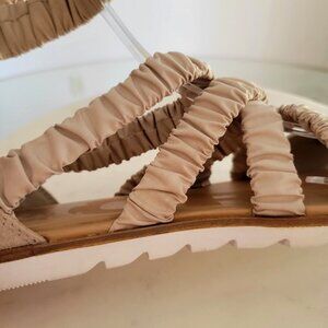 Sorel Ella II Ankle Strap Ruched Elastic Sandals Leather Flats Beige Size 6.5