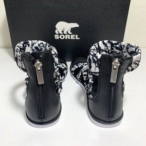 Sorel Ella II Ankle Strap Sandals Leather Flats White & Black Print Size 5.5 NEW