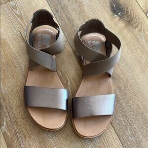 Sorel flat sandals in leather and metallic rose gold with tan elastic. EVA foam footbed with signature rubber outsole in razor shape for ultimate traction. In great condition, gently worn. Size 8.5