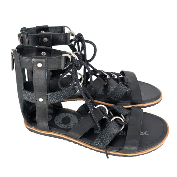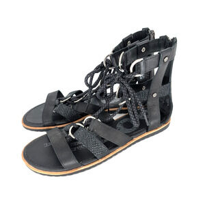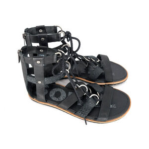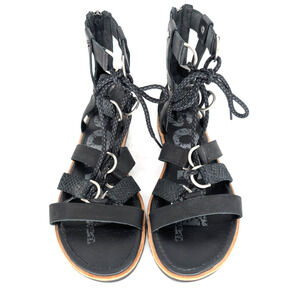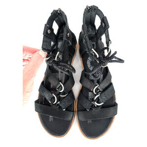 Sorel Womens Black Leather Lace Up Strappy Gladiator Back Zip Flat Sandals