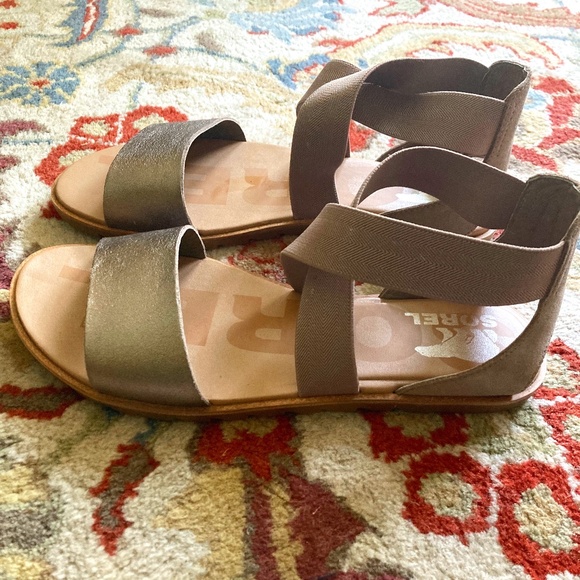 Size 9 and the color is ash brown. Sandals were worn twice so like new condition before I realized they didn't fit quite right. The strap across the toe is a little shimmery. Purchased new for $90.