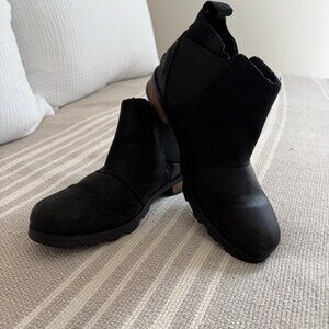 The versatile Emelie Chelsea boot is designed with seam-sealed waterproof technology that pairs functionality with style. Lug soles, stacked wooden heel. Excellent condition. Worn once, comes in box. Super comfortable and warm!
