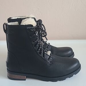 Sorel Emelie Short Lace Cozy - Waterproof Black Leather Shearling Boots Size 6.5