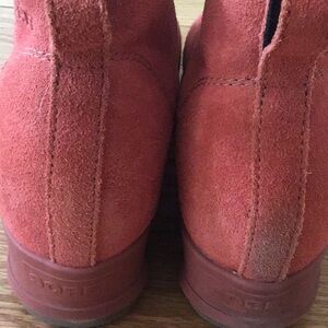These Sorel ankle boots feature a vibrant coral hue, crafted from a soft suede material for a luxurious feel. The Chelsea-style design includes elastic side panels for easy wear, while the rounded toe and durable rubber sole ensure comfort and style. Perfect for adding a pop of color to any outfit, these boots are a versatile addition to your footwear collection.