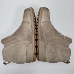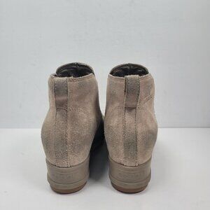 These taupe suede wedge booties from Sorel offer a stylish yet practical design, featuring a slip-on style and durable sole for versatile wear.